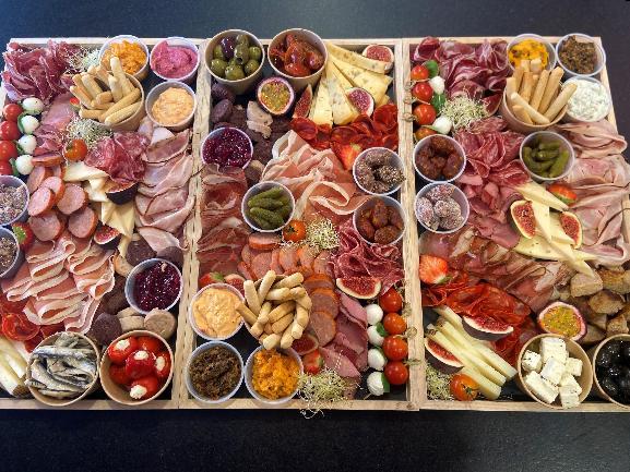 Uitgebreide tapas plank met fijne huisbereide charcuterie, apero kaas, tapenades, dipsausjes, afgewerkt met wat fruit en groen. ... topper voor bij een uitgebreide aperitief of als voorgerecht. 1 plank is voor 4 personen. (op foto 3 planken)